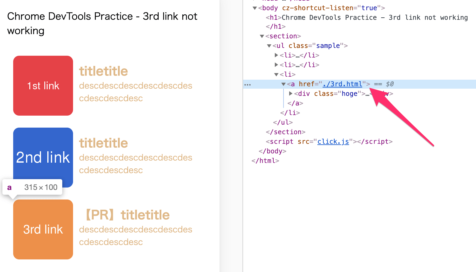 実際に実行していくとわかると思いますが、3つめのリンクをクリックした時だけ、「href」という変数の値に「undefined」が入ります。
