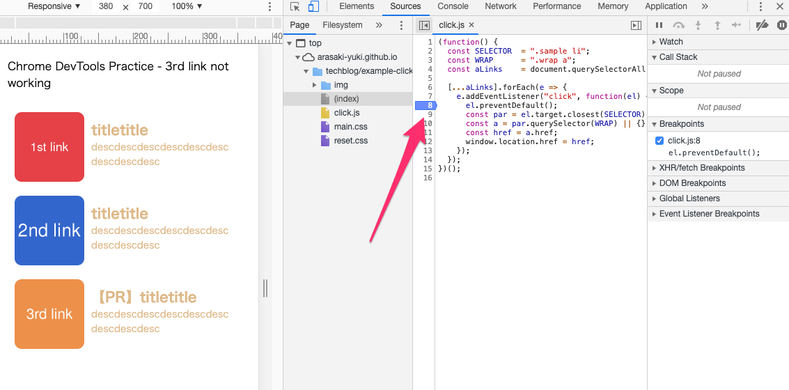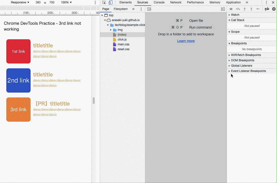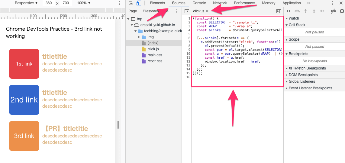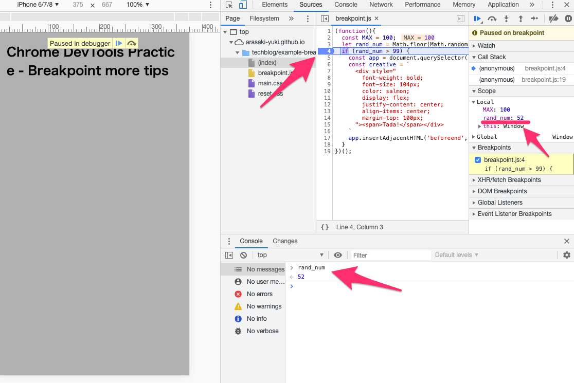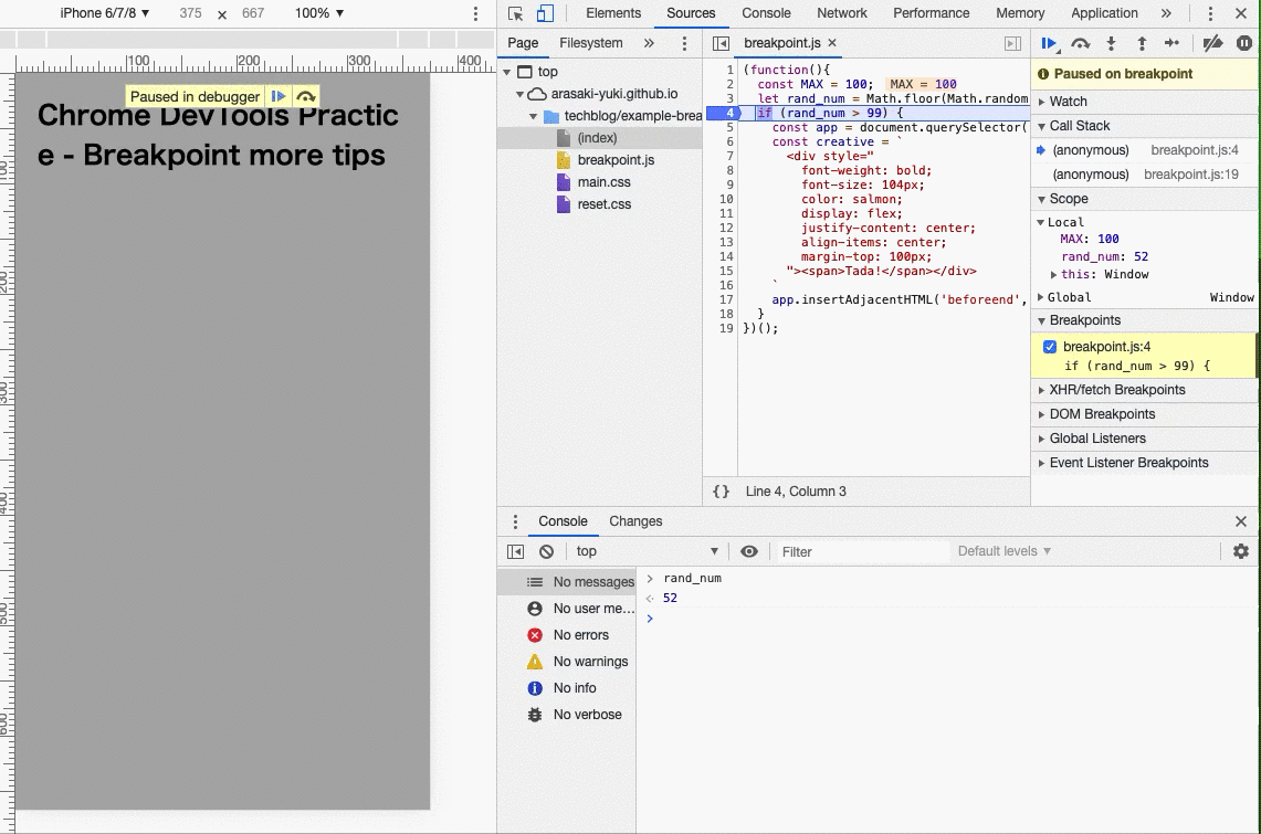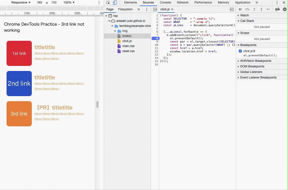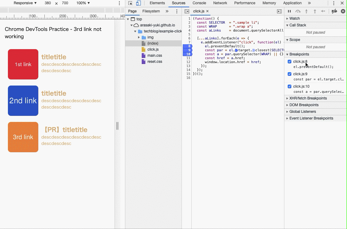 ブレークポイントについては前回触れておりませんが、Googleの『Chrome DevTools で JavaScript をデバッグする』が詳しいので、触れたことない方は事前に目を通しておくと、よりイメージつきやすいかと思います。