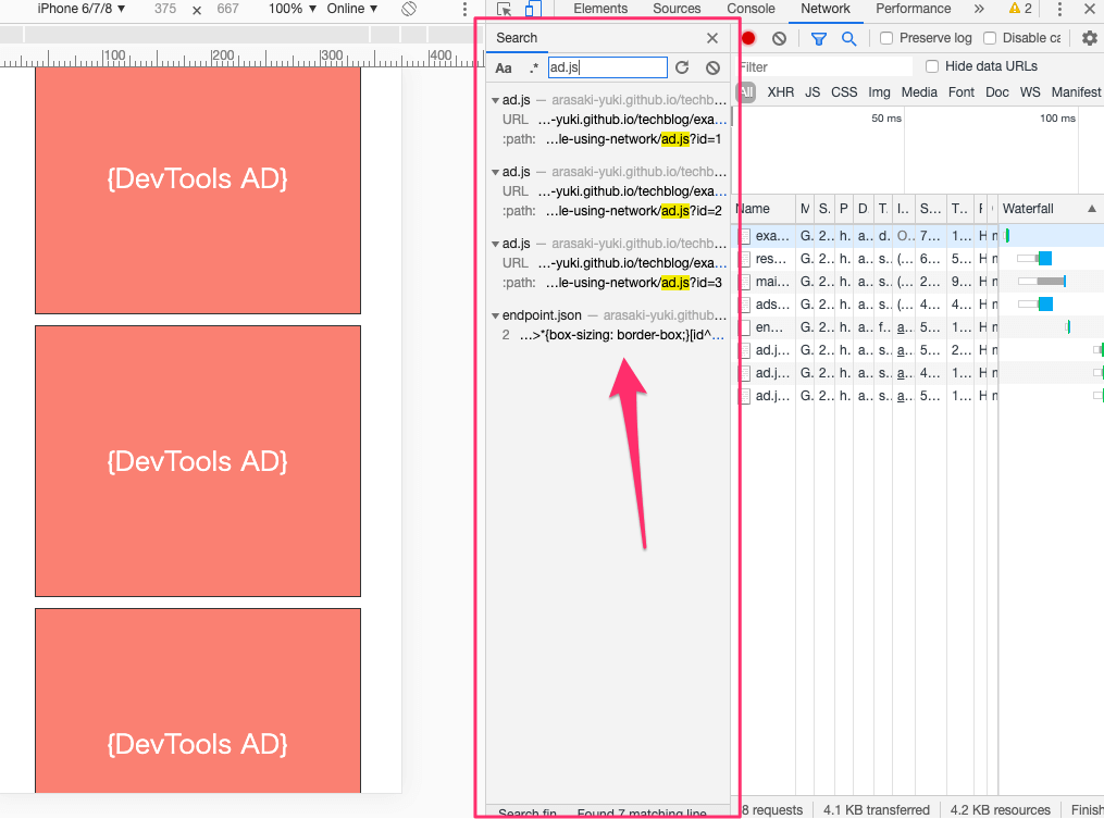『Elements』パネルで見たところ「ad.js」というscriptを読み込むようなので、「ad.js」という文字列で検索します。検索結果にはリクエストURLとレスポンス内容が表示されます。