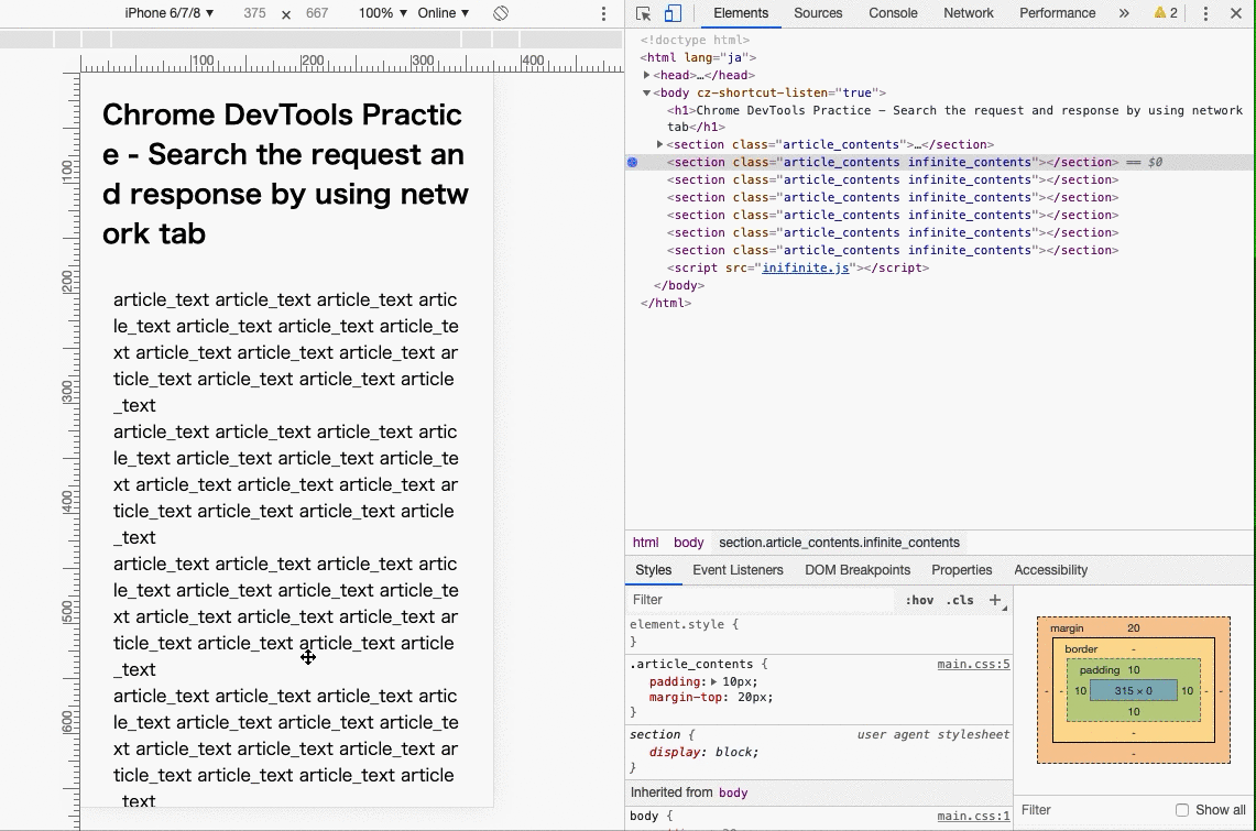 3. インフィニティスクロールコンテンツの表示不具合(Elements/DOM Breakpoints/Breakpoint)