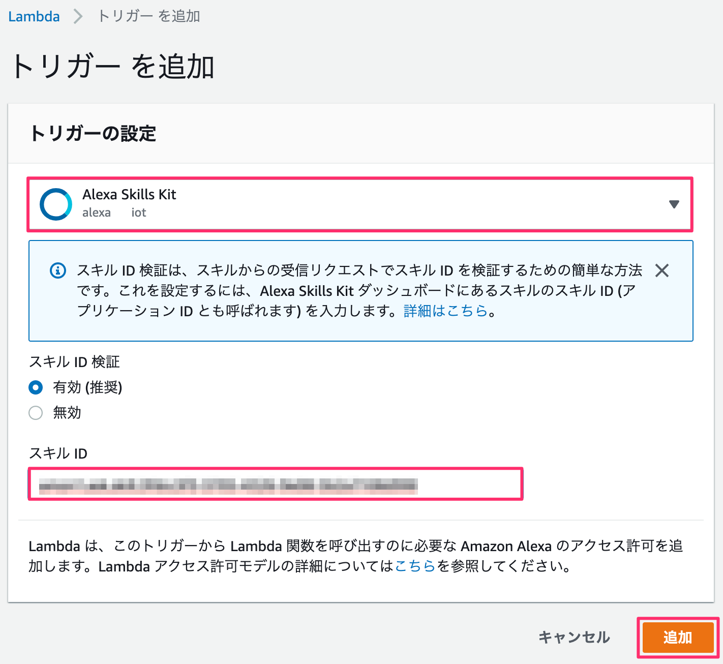 選択するとスキルIDの入力画面が表示されますので、Alexaスキル作成画面よりスキルIDをコピーし、ペーストします。