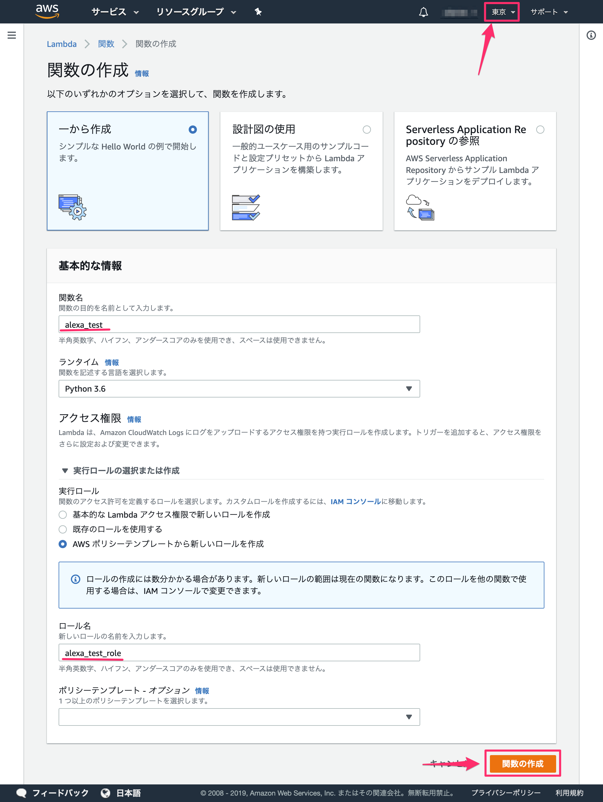 Lambda画面へログインを行い、「関数の作成」をクリックし、作成画面を開きます。