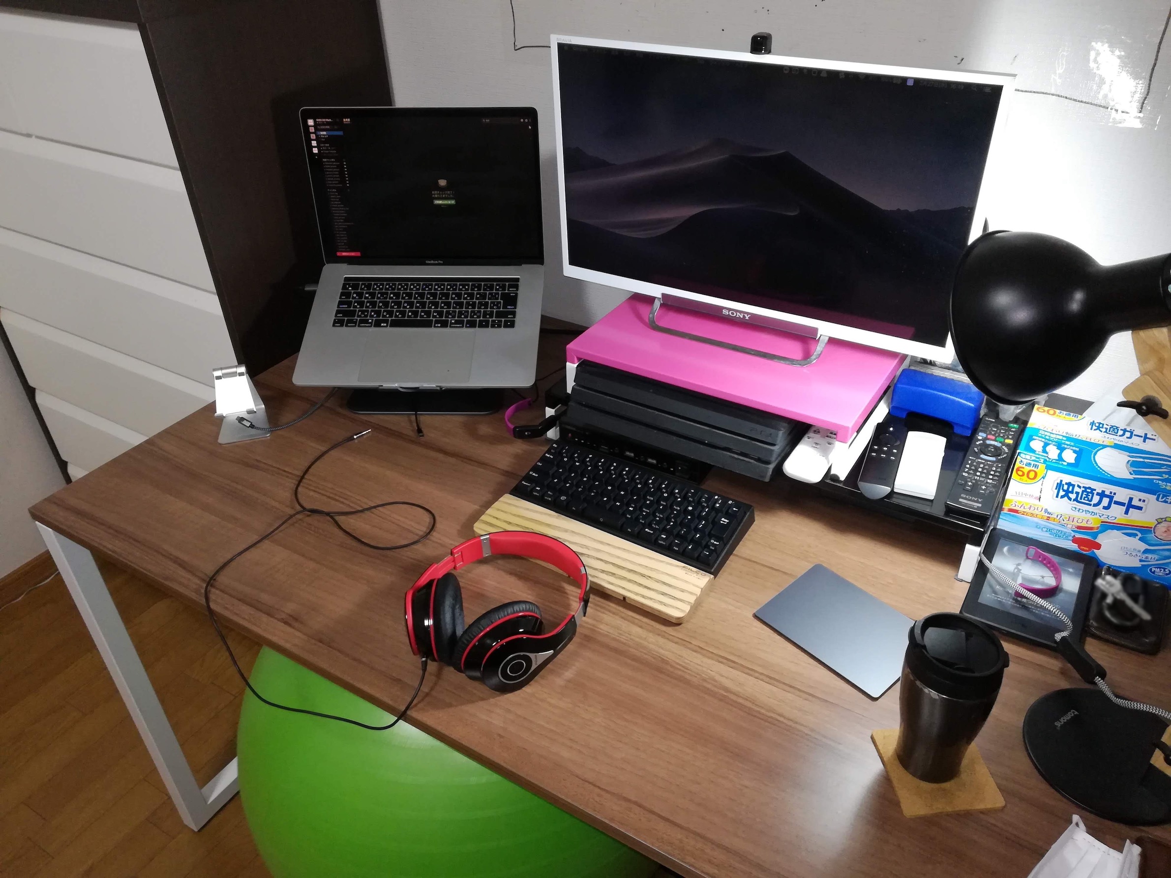 • 机はオフィス机、椅子はオフィスでも利用しているバランスボールを採用