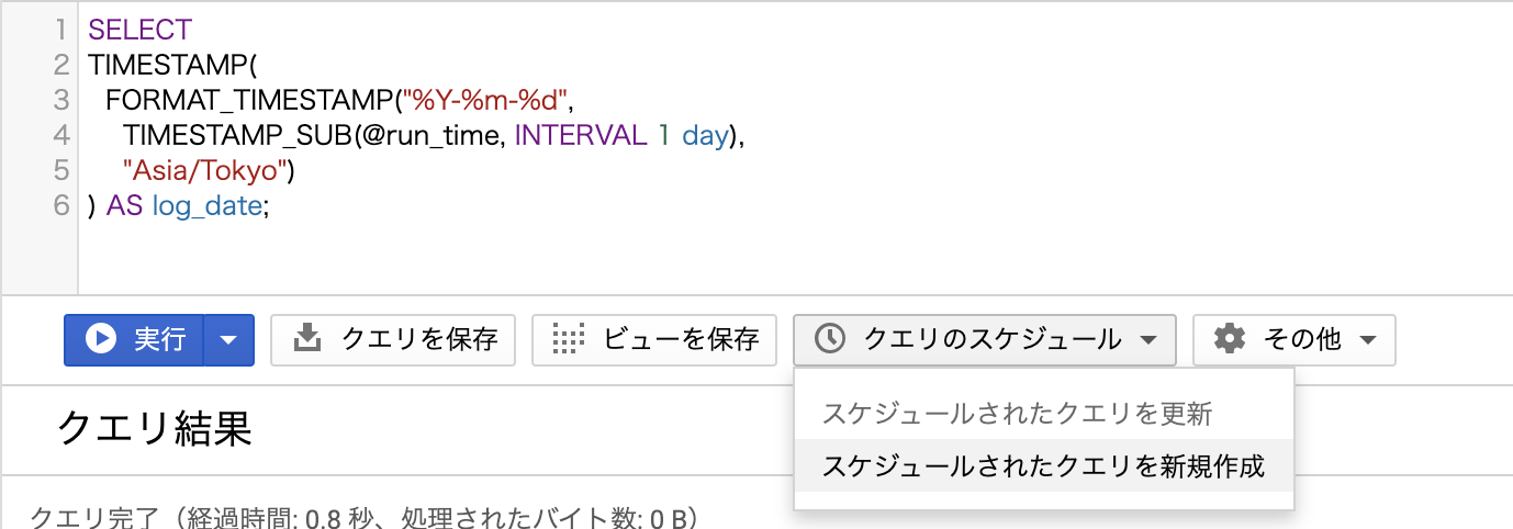 SELECT TIMESTAMP( FORMAT_TIMESTAMP("%Y-%m-%d", TIMESTAMP_SUB(@run_time, INTERVAL 1 day), "Asia/Tokyo") ) AS log_date; |