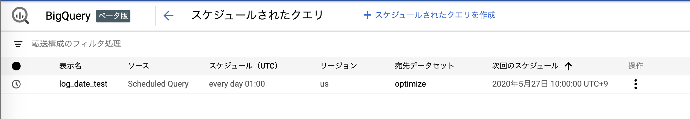 「スケジュール」選択したクエリの登録状態を確認するにはBigQuery画面で「スケジュールされたクエリ」を選択します。クエリのスケジュールのリストが表示されます。