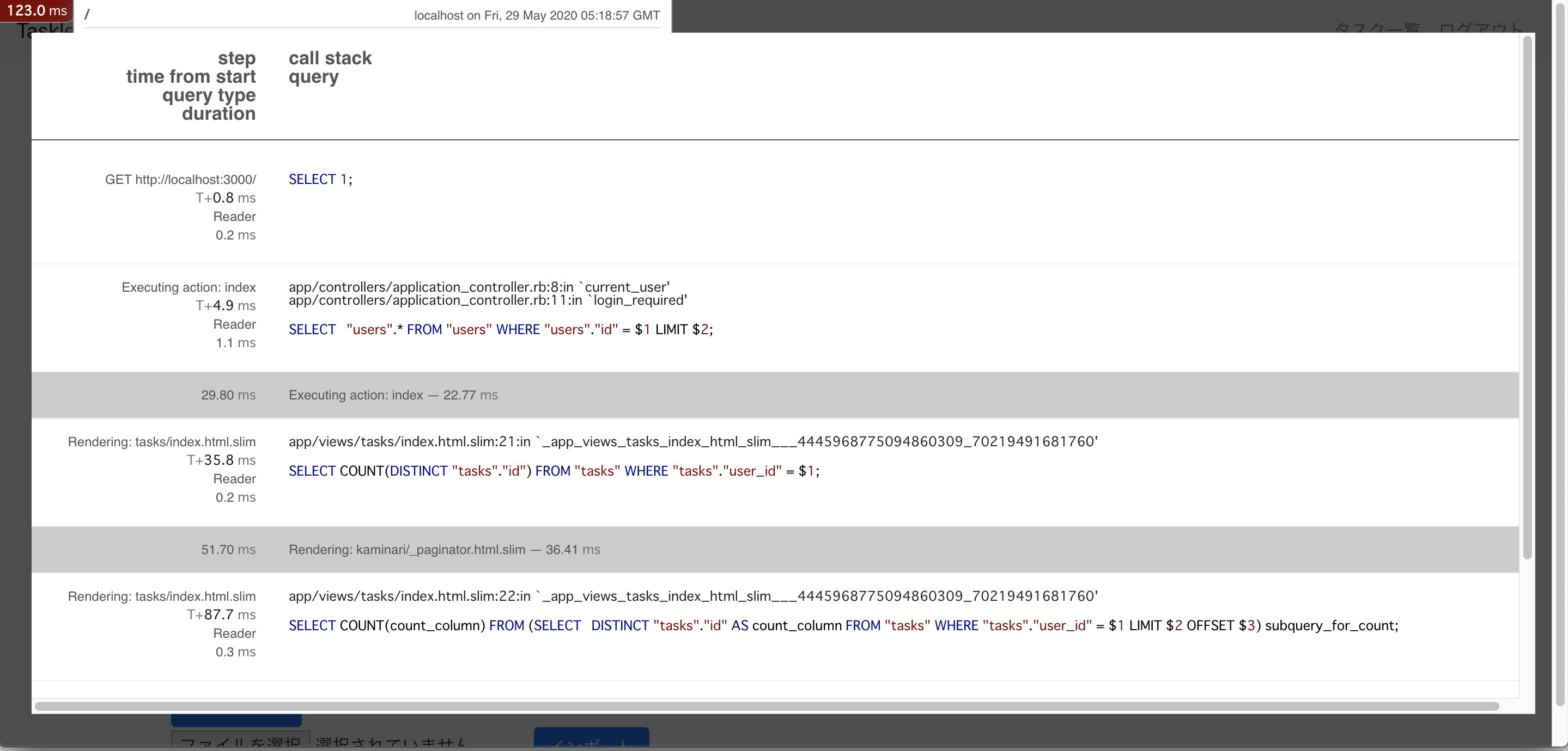 こちらは「〇〇sql(〇〇はSQLが発行された数)」をクリックしてSQLの詳細を表示しているところです。