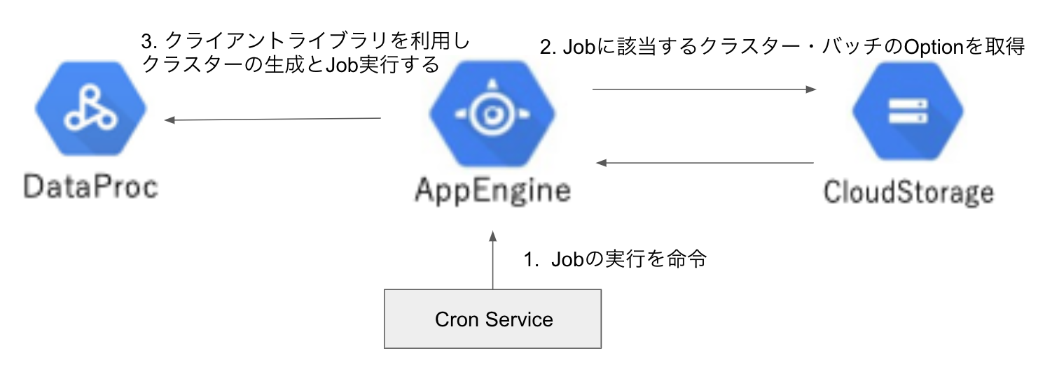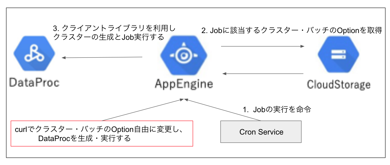 ここまで、構築・実装を行うと普段は以下のようにCron serviceで定期的にGAEにバッチの実行を命令することになり、何か問題があればCurlを利用しDataProcのスペックやバッチのオプションを調整しながら実行させることが可能となります。