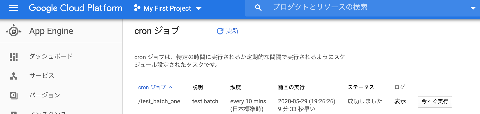 ・Jobの実行履歴確認(cron serviceに登録されている通りに10分ごとに実行されている)