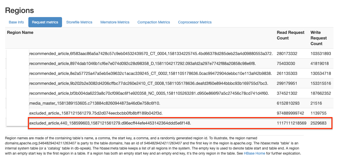 すると、赤枠で囲ったexcluded_articleのRead Request Countが1番多く、またRowKeyが “440_xxxxxx” となっており、前述した条件を満たすようなデータになっています。