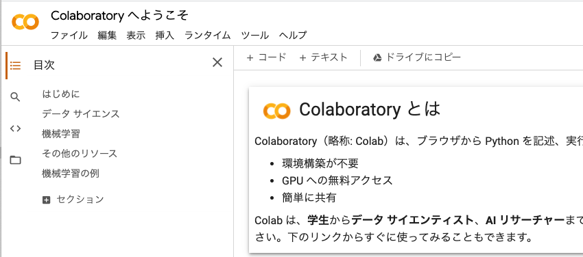 Google アカウントにログインした状態で、Colaboratory へようこそページへアクセスしてください。