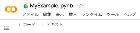 ファイル名部分に入力カーソルを移動するとファイル名を変更することができます。今回はMyExample.ipynbに変更しました。