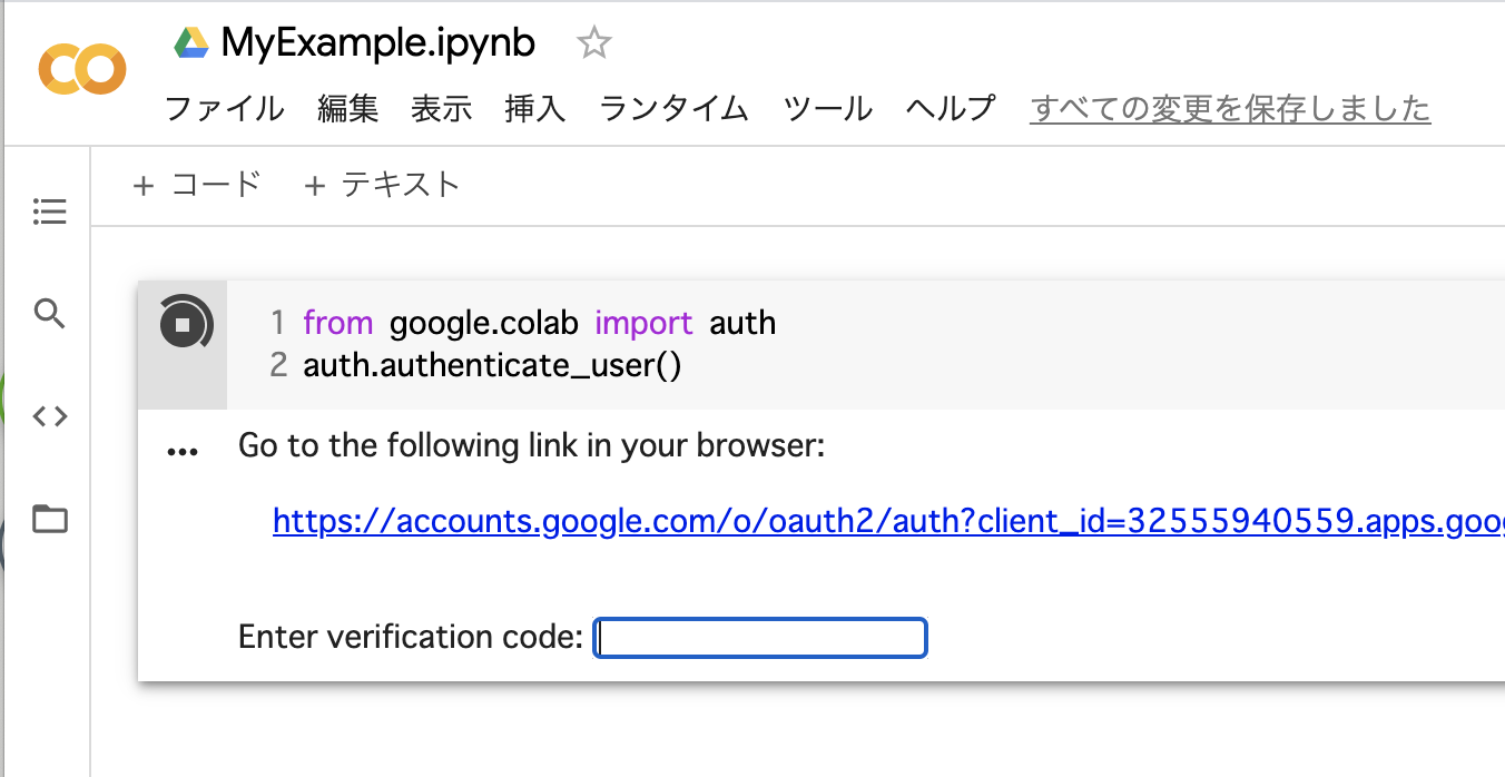 「+コード」を選択してコードセルを追加し、以下のように認証のためのPythonプログラムを記述します。
