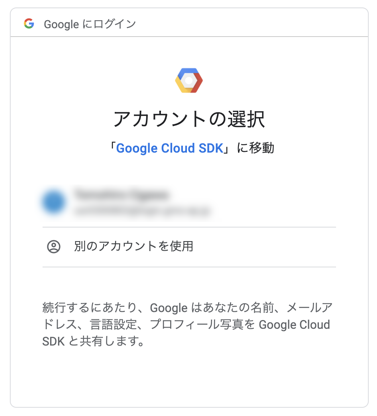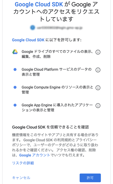 Google Cloud SDKにGoogleアカウントへのアクセスを許可するための画面が表示されるので、許可を選択します。