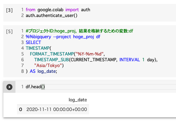 #この例ではマジックコマンドの引数として、プロジェクトID:hoge_proj, 結果を格納するための変数:dfを設定しています。 %%bigquery --project hoge_proj df SELECT TIMESTAMP( FORMAT_TIMESTAMP("%Y-%m-%d", TIMESTAMP_SUB(CURRENT_TIMESTAMP, INTERVAL 1 day), "Asia/Tokyo") ) AS log_date; |