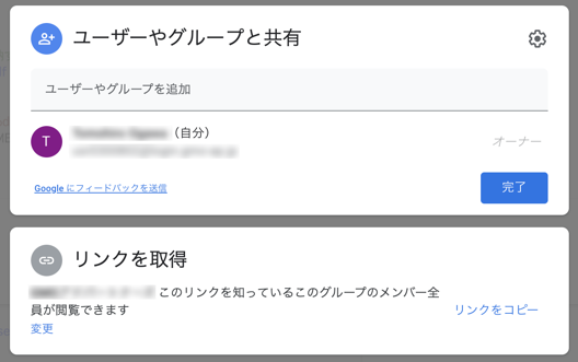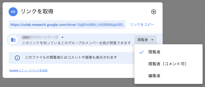 「リンクを取得」の「変更」を選択します。以下のように共有のためのリンクの表示や権限を設定するための画面が表示されます。