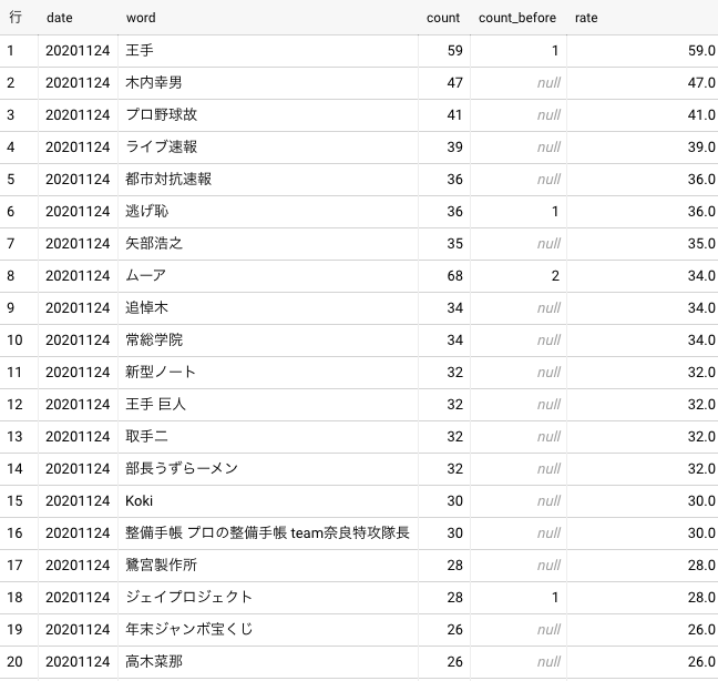 contents tableの単語を集計し前日から急上昇したワード
