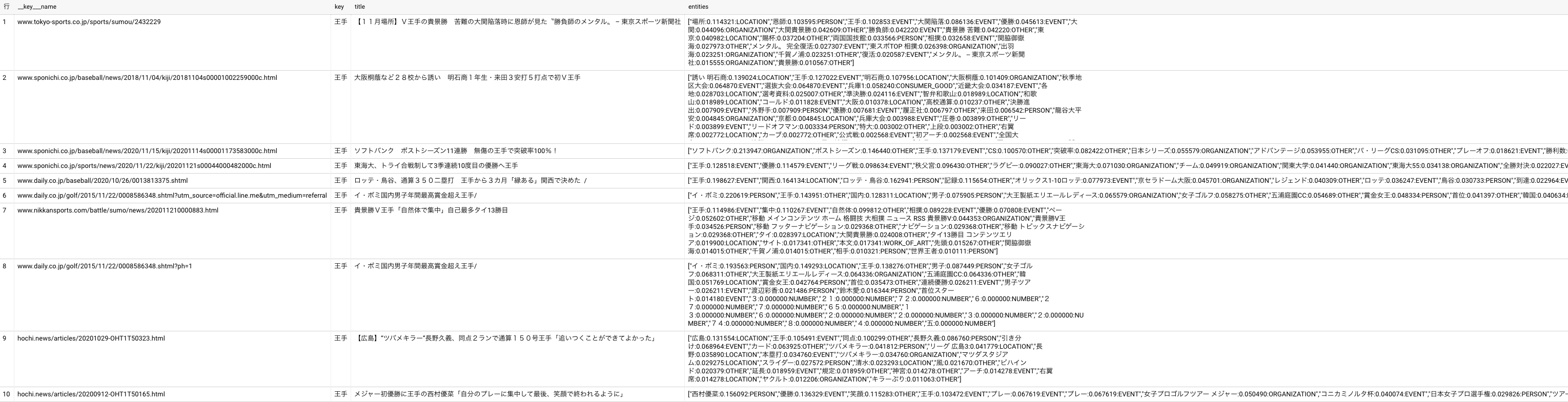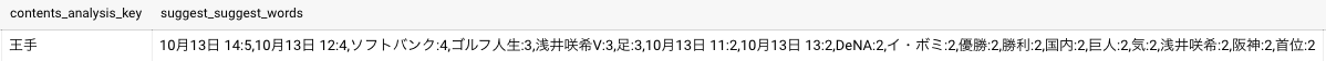 contents tableとimp tableから”王手”というワードを含んだ記事の単語を集計して上位のワードをサジェストワードとして取得してみました