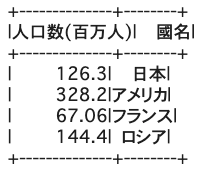 population_data = [{"國名": '日本', '人口数(百万人)': 126.3}, {"國名": 'アメリカ', '人口数(百万人)': 328.2}, {"國名": 'フランス', '人口数(百万人)': 67.06}, {"國名": 'ロシア', '人口数(百万人)': 144.4}] |