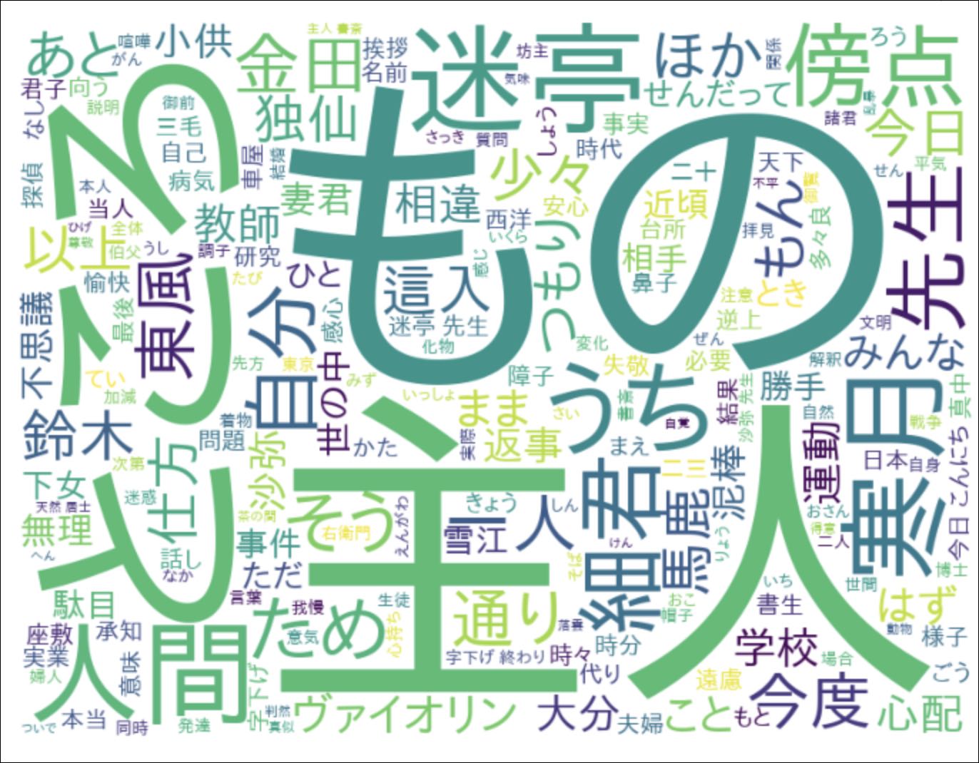 # ワードクラウド表示 font_path_gothic = '/usr/share/fonts/opentype/ipafont-gothic/ipagp.ttf' words = ["私","わたし","僕","あなた","みんな","ただ","ほか","それ", "もの", "これ", "ところ","ため","うち","ここ","そう","どこ", "つもり", "いつ","あと","もん","はず","こと","そこ","あれ","なに","傍点","まま","事","人","方","何","時","一","二","三","四","五","六","七","八","九","十"] result = WordCloud(width=800, height=600, background_color='white', font_path=font_path_gothic, regexp=r"[\w']+", stopwords=words).generate(word_chain) plt.figure(figsize=(12,10)) plt.imshow(result) plt.axis('off') plt.show() |