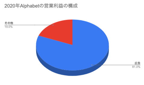 インターネット広告の収益は多くのIT企業の最も重要な利益の一つであります。下図はGoogleの親会社Alphabetの2020年の利益の構成です。