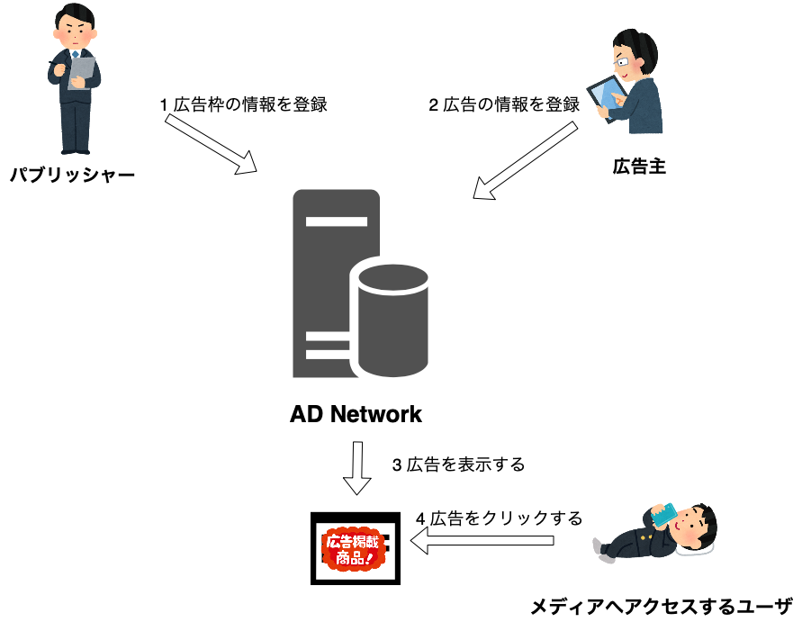 パブリッシャーは広告枠(メディアのURLなど)の情報、広告主は出したい広告の情報(画像、文面など)をAD Networkに登録します。パブリッシャーが運営しているメディアへユーザーがアクセスするとAD Networkは自動的に適切な広告主の広告を表示します。一般的に表示した広告のクリック毎に広告主に課金します。