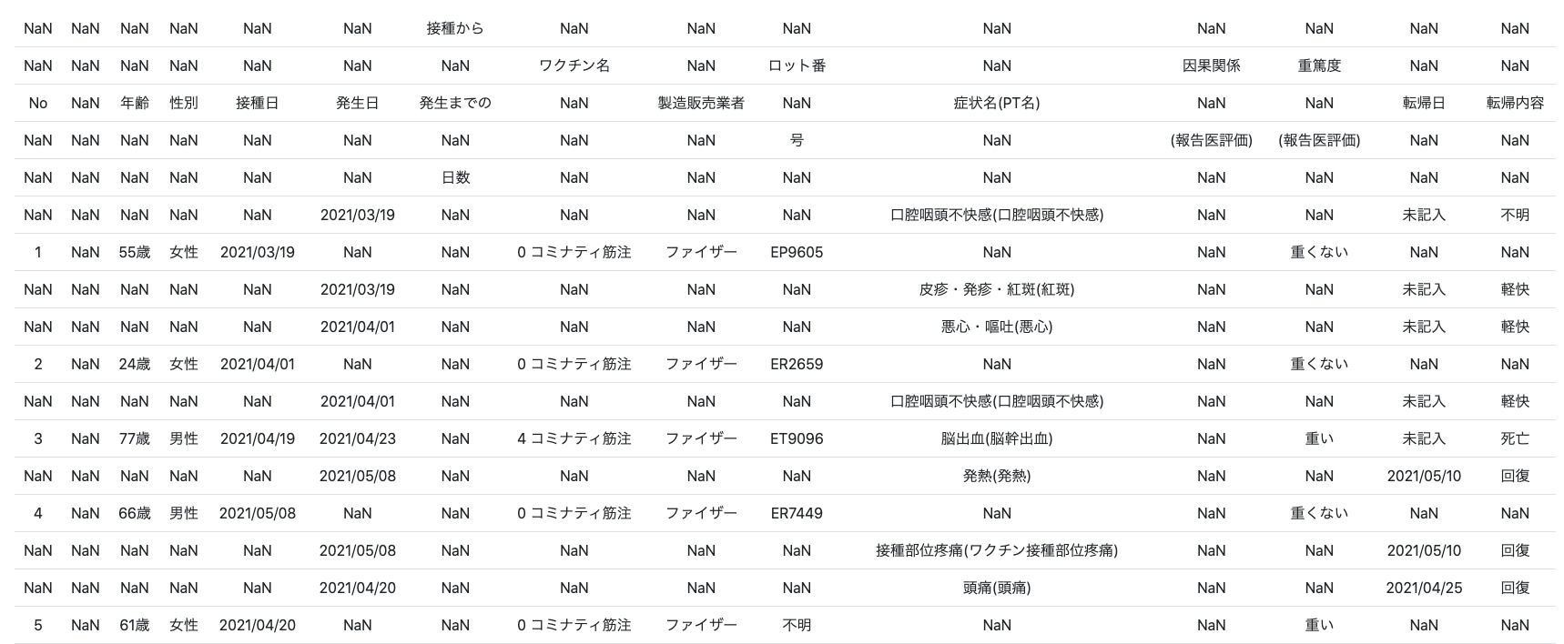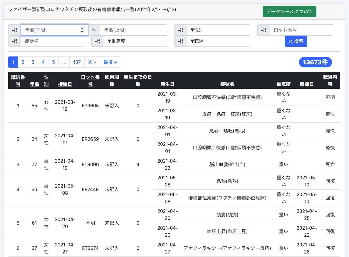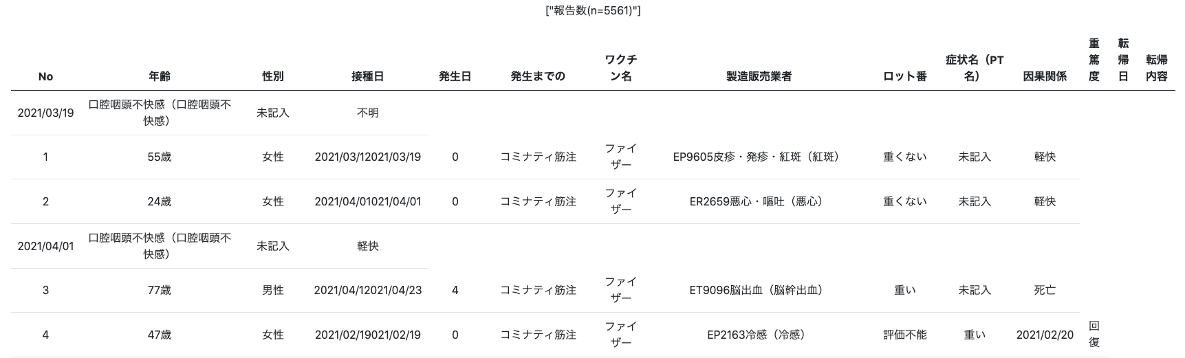 そこで、どのような副反応のリスクがあるのか調べてみましたが、情報がPDFでわかりづらかったため、今回はこちらのPDFをパースして、わかりやすく表示してみたいと思います。