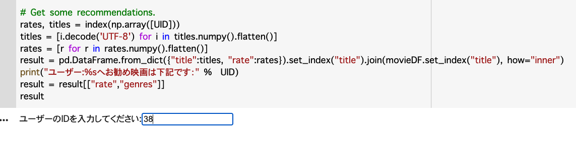 index = tfrs.layers.factorized_top_k.BruteForce(model.user_model) index.index_from_dataset( movies.batch(100).map(lambda title: (title, model.movie_model(title))) ) UID = input ("ユーザーのIDを入力してください:") rateUser = rateDF[rateDF["userId"] == 38] rateUser = rateUser.set_index(["movieId"]).join(movieDF.set_index(["movieId"]), how="inner") print("ユーザー %s に評価は高い映画のTOP10" % UID) df = rateUser[["userId", "title", "genres", "rating"]].sort_values(by="rating", ascending=False).head(10) display(df) # Get some recommendations. rates, titles = index(np.array([UID])) titles = [i.decode('UTF-8') for i in titles.numpy().flatten()] rates = [r for r in rates.numpy().flatten()] result = pd.DataFrame.from_dict({"title":titles, "rate":rates}).set_index("title").join(movieDF.set_index("title"), how="inner") print("ユーザー:%sへお勧め映画は下記です:" % UID) result = result[["rate","genres"]] result |