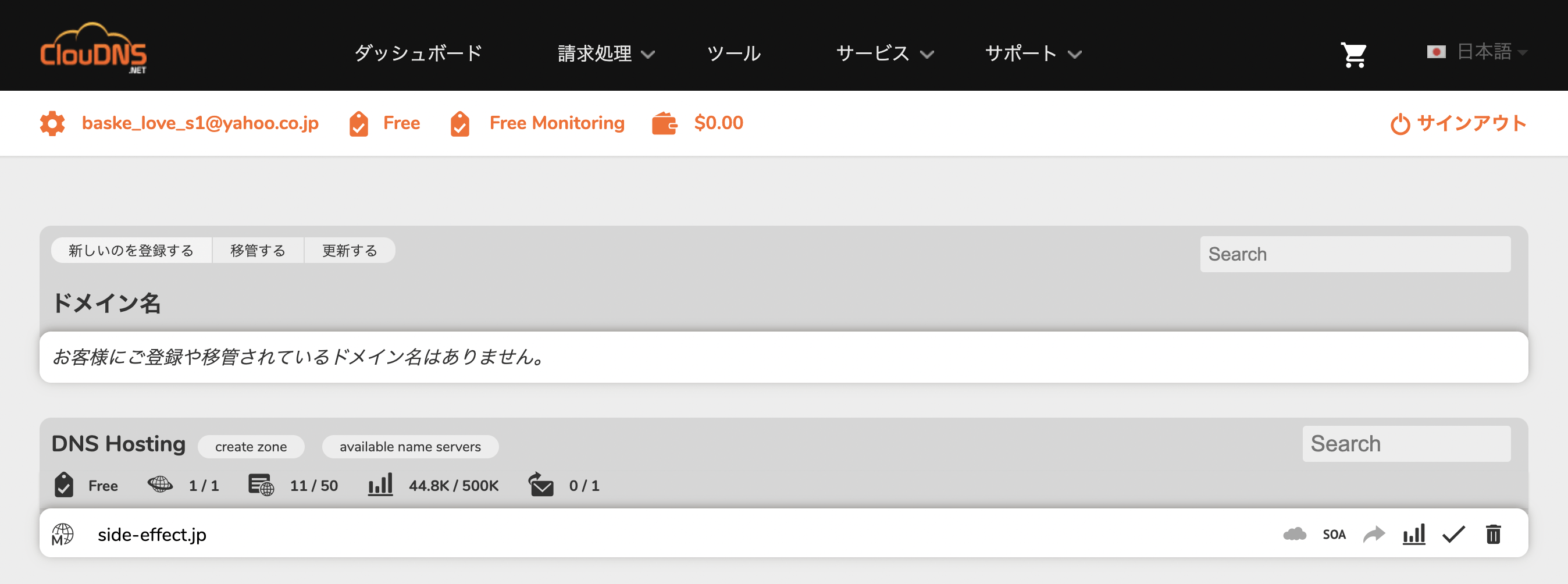 ドメイン取得後、すぐに移管ができないみたいだったのでDNSサーバーを立てようとも考えましたが、フリーのClouDNSというサービスでDNSを設定することができました。