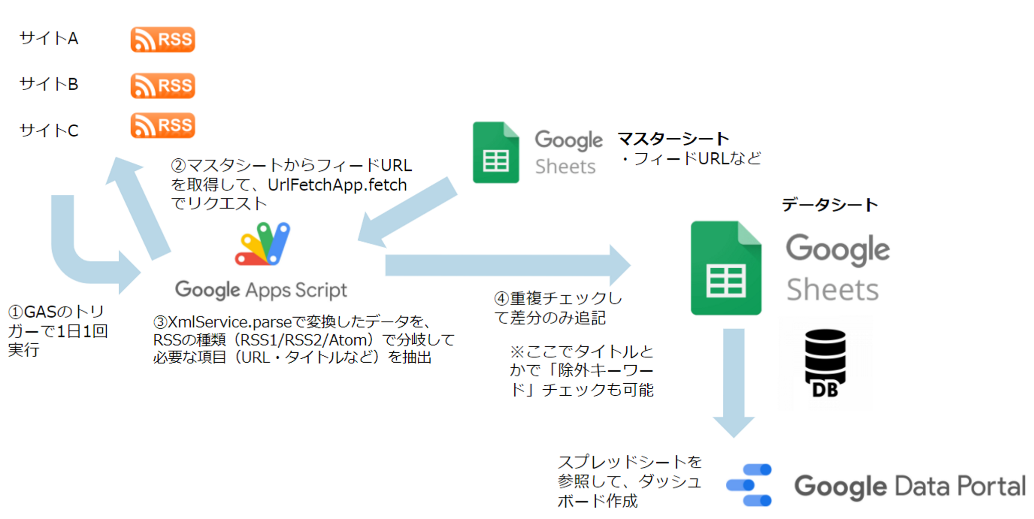大まかに以下の流れで処理しています。- スプレッドシートのマスタシートからフィードURLを取得して、UrlFetchApp.fetchでリクエスト(図中②の処理)