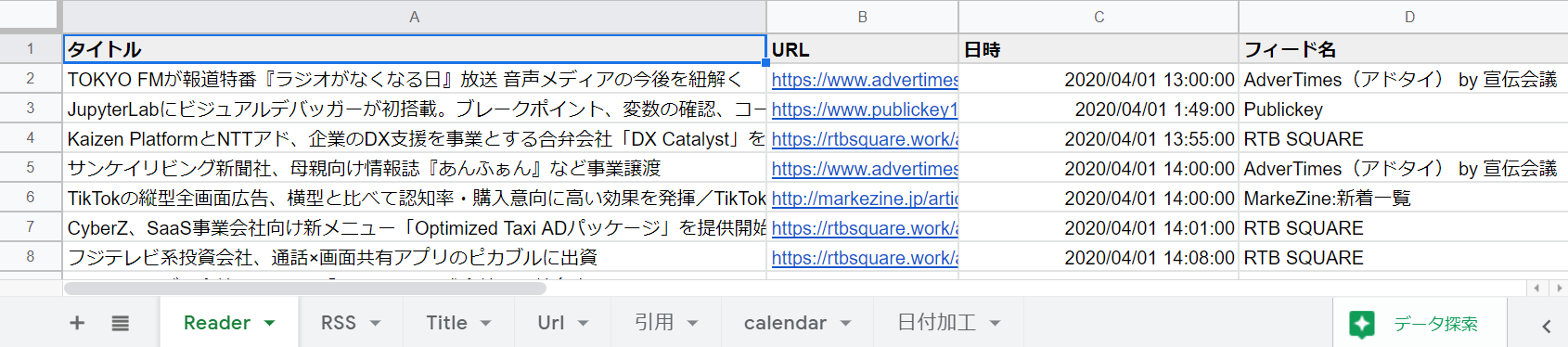 GASで取得したRSSフィードのデータの保存先です。 データポータルで参照するデータソースは、このシートになります。