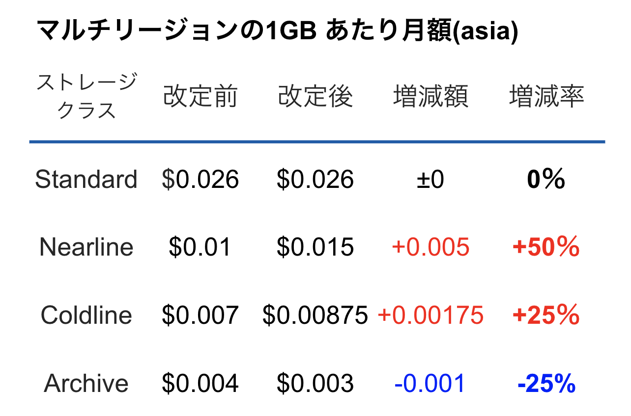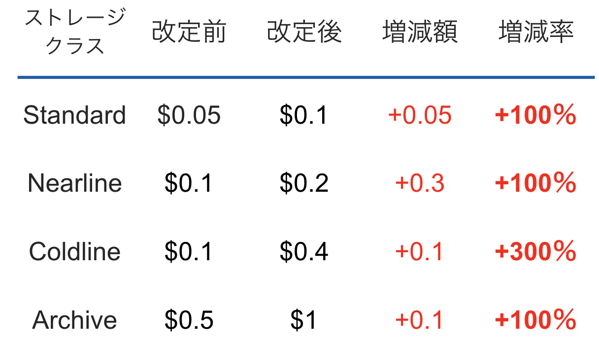 NearlineとColdlineが値上げし、代わりにArchiveが値下げになっています。
