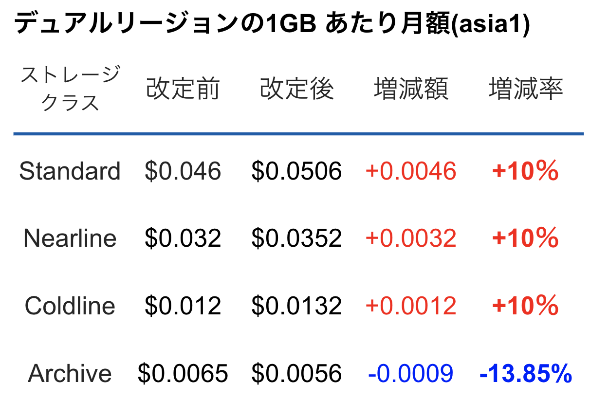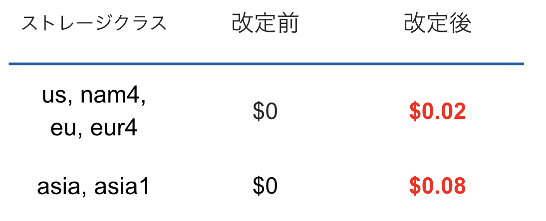 マルチ/デュアルリージョンの1GBあたりの月額料金が変わります。