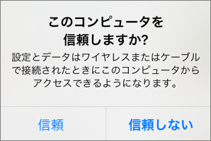 ライトニングUSBケーブルを利用してiPhoneをMacに接続します。→「このコンピュータを信頼しますか?」画面が表示されるので「信頼」を選択します。