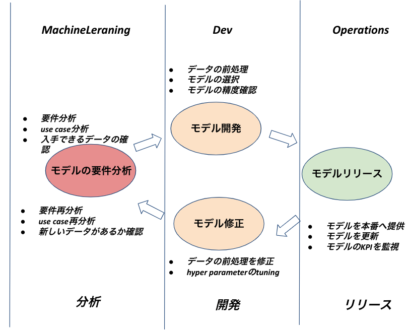MLOPSは分析(ML)+開発(Dev)+リリース(Operations)の組み合わせです。 機械学習の開発効率を向上させる為に、機械学習project の開発原則とルールが纏められています。