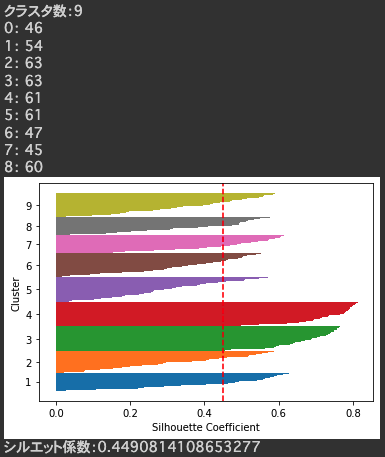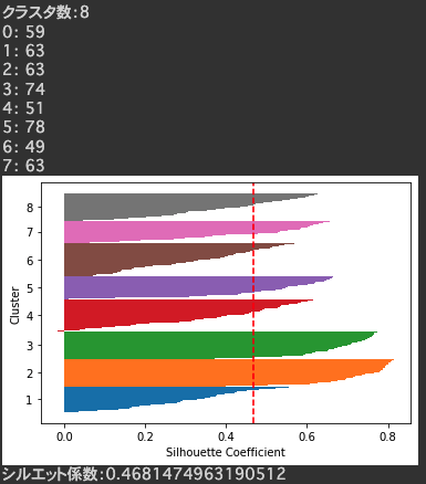 各モデルのシルエット図を確認していくと、クラスタ数8,9あたりで綺麗なシルエット図ができていました。