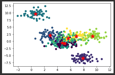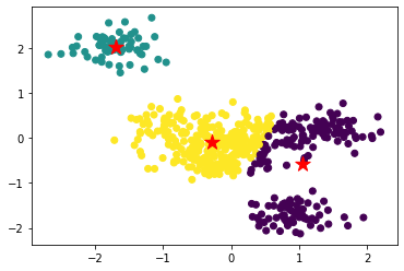 from sklearn.cluster import KMeans #モデル作成 km = KMeans(n_clusters=3, random_state=0) #学習 km.fit(data_norm) #結果を可視化 plt.scatter(data_norm[:, 0], data_norm[:, 1], c=km.labels_) plt.scatter(km.cluster_centers_[:, 0], km.cluster_centers_[:, 1], color='red', marker='*', s=200) |