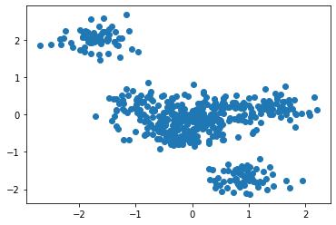 from sklearn import preprocessing # 標準化 sc = preprocessing.StandardScaler() data_norm = sc.fit_transform(data) # 標準化した後のデータ分布を確認 plt.scatter(data_norm[:, 0], data_norm[:, 1]) |