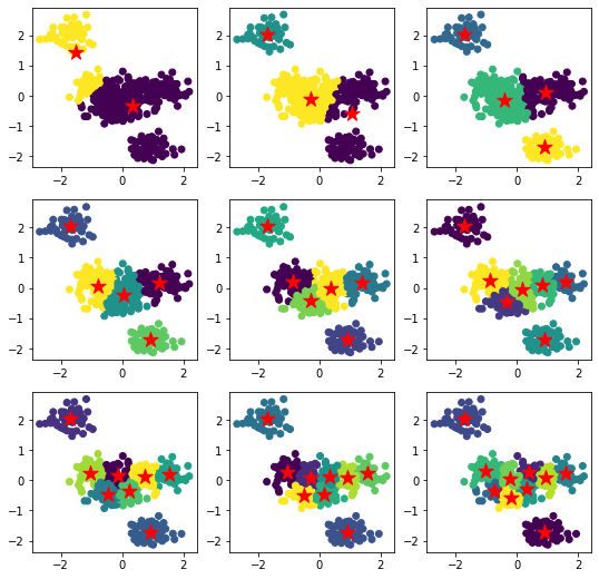 model_list = [KMeans(n_clusters=i, random_state=0) for i in range(2, 11)] pred_list = [] center_list = [] loss_list = [] for i in range(len(model_list)): model_list[i].fit(data_norm) pred_list.append(model_list[i].labels_) center_list.append(model_list[i].cluster_centers_) loss_list.append(model_list[i].inertia_) plt.figure(figsize=(9, 9)) for i in range(len(pred_list)): plt.subplot(3, 3, i+1) plt.scatter(data_norm[:, 0], data_norm[:, 1], c=pred_list[i]) plt.scatter(center_list[i][:, 0], center_list[i][:, 1], color='red', marker='*', s=200) plt.show() |