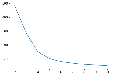 plt.plot(range(2,11), loss_list) plt.xticks(range(2,11)) plt.show() |