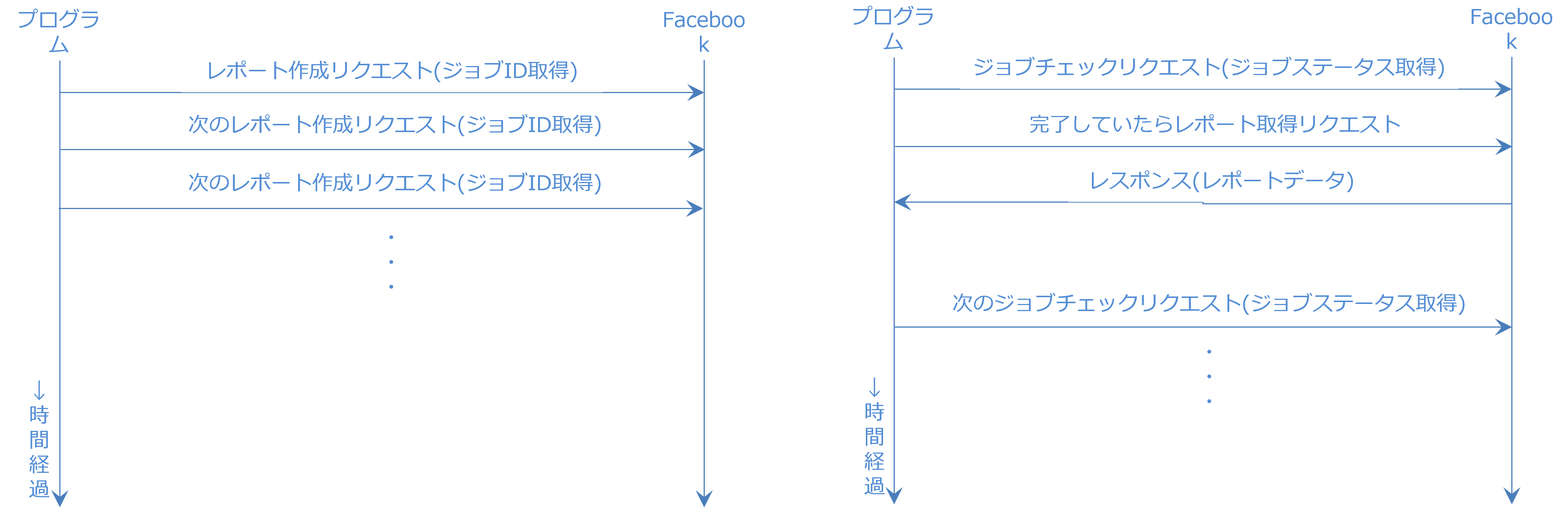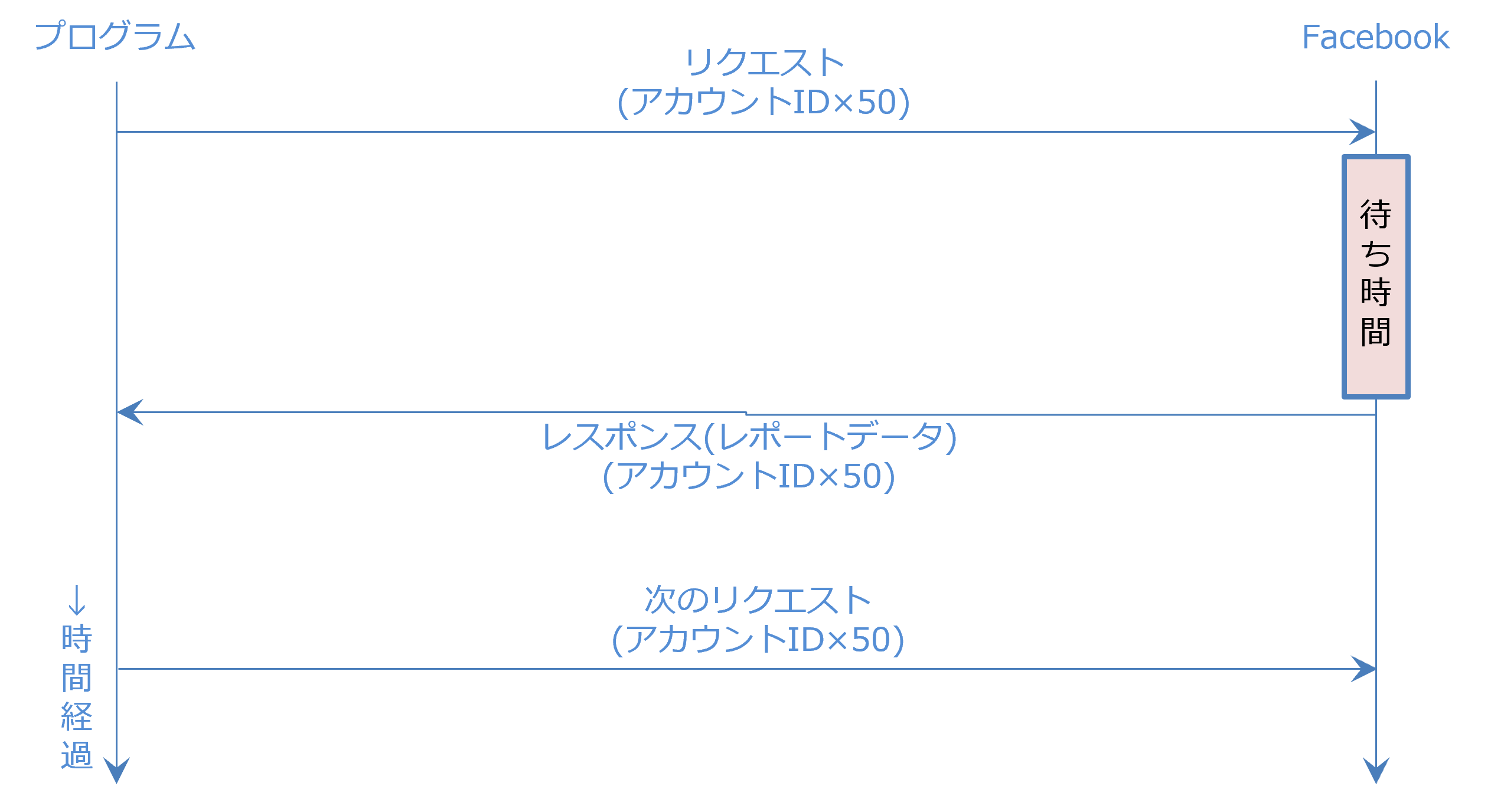 図ですが、縦軸が時間経過、左がリクエスト送信プログラム、右がFacebookです。