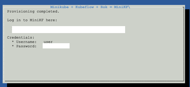 MiniKF のinstance が準備できたら下記のような設定画面が出てきます。Kubeflow のDashboard のURL とユーザー名、パスワードが記載されていますがinstance はまだ初期化されてないので接続できません。