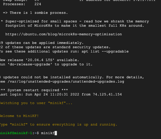 SSHのボタンを押してkubeflowのinstanceへTerminalで接続してMiniKFを初期化のコマンド:miniKFを入力してください。