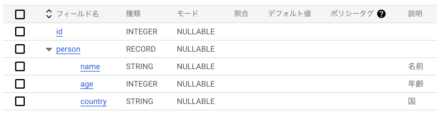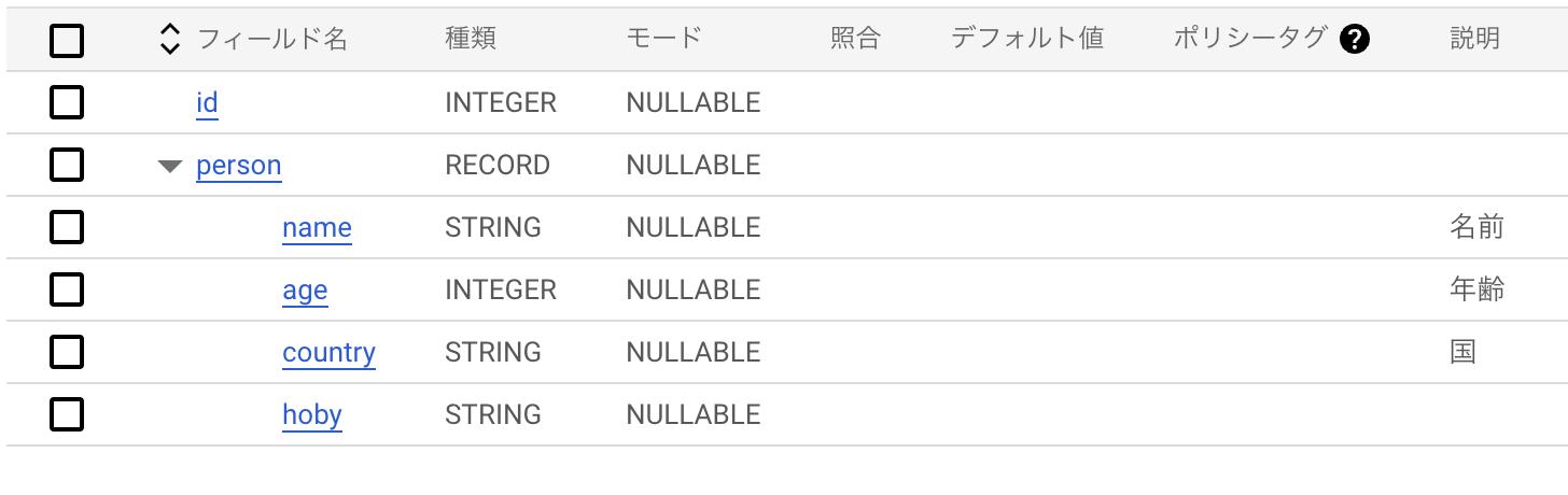vi table.json [ { "mode": "NULLABLE", "name": "id", "type": "INTEGER" }, { "fields": [ { "description": "\u540d\u524d", "mode": "NULLABLE", "name": "name", "type": "STRING" }, { "description": "\u5e74\u9f62", "mode": "NULLABLE", "name": "age", "type": "INTEGER" }, { "description": "\u56fd", "mode": "NULLABLE", "name": "country", "type": "STRING" }, { "description": "", "mode": "NULLABLE", "name": "hoby", "type": "STRING" } ], "mode": "NULLABLE", "name": "person", "type": "RECORD" } ] |