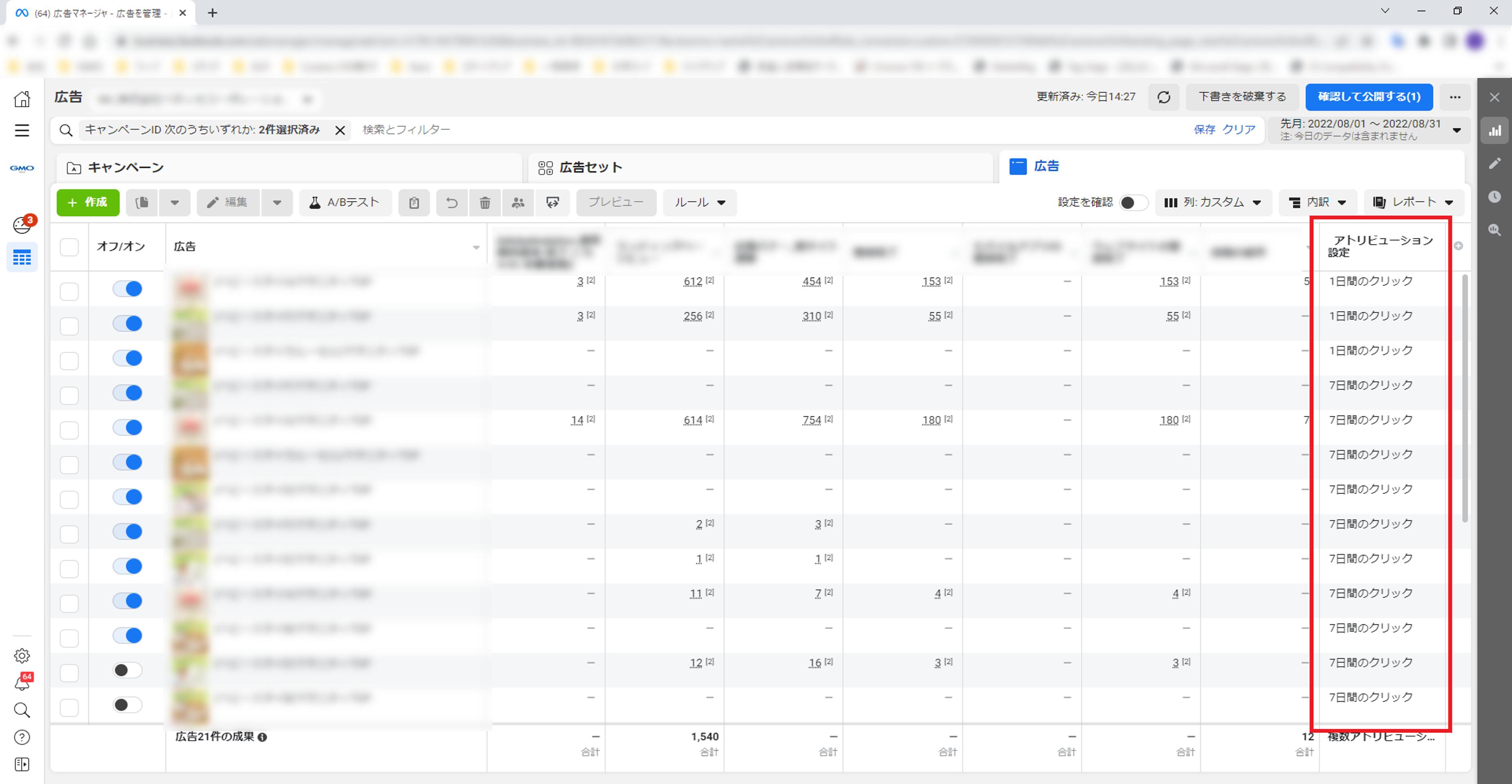 例えば下記の場合、広告1ではそれぞれのコンバージョンの1d_clickの合計、広告2では7d_clickの合計というように集計する必要があります。
