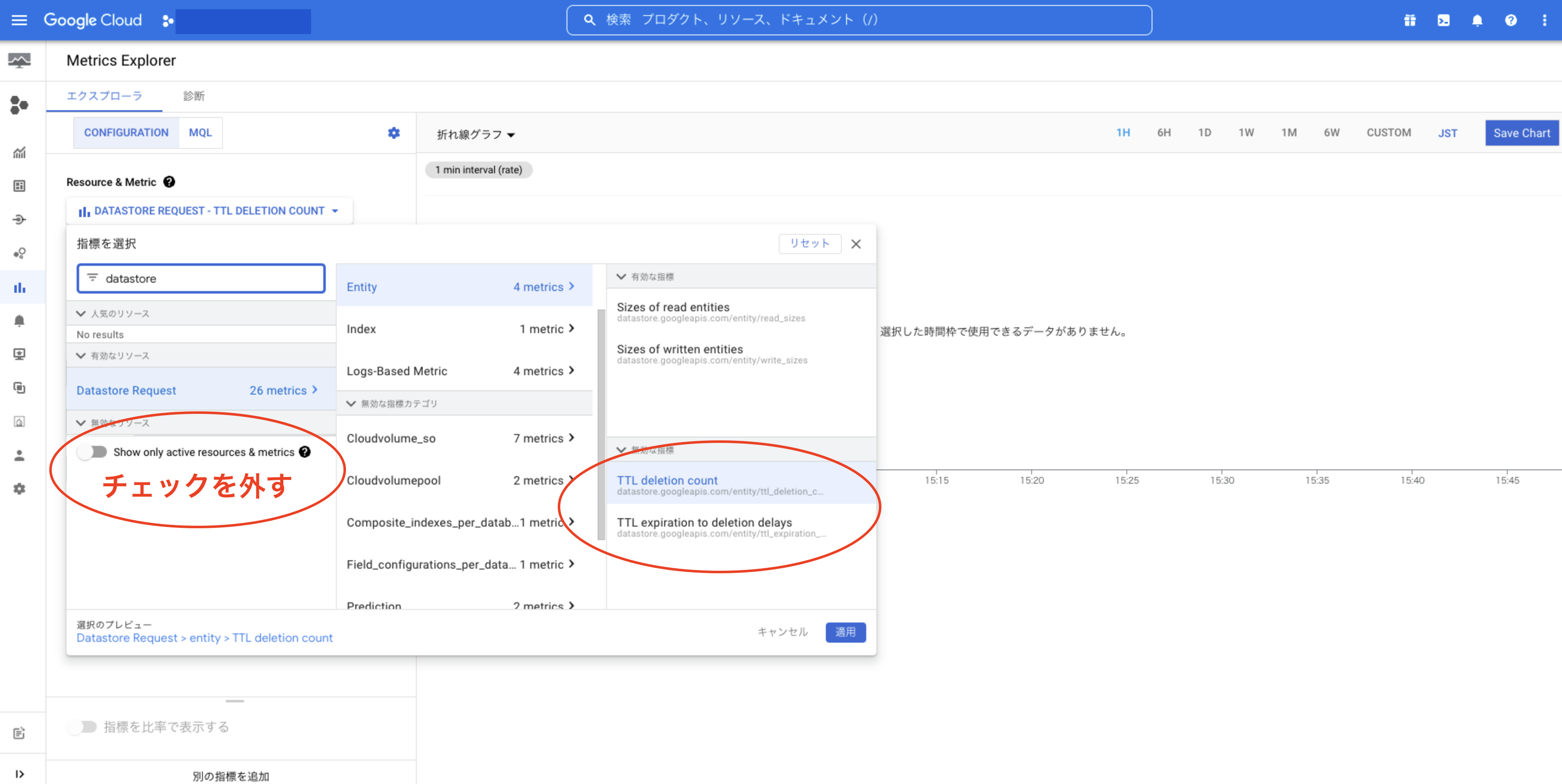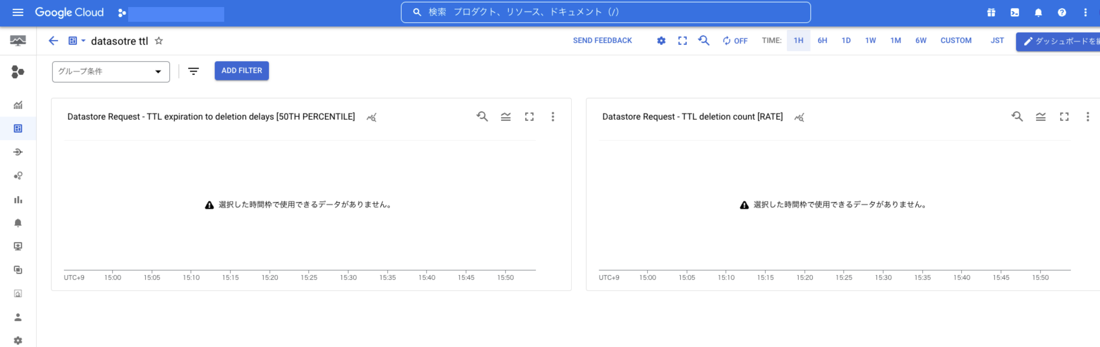 ポリシーが作成されている間に削除の状況をモニタリングするためにダッシュボードを作成しておきます。Metrics Explorerから指標に「TTL delettion count」と「TTL expiration to deletion delays」を選んでダッシュボードを作成しておきます。 それぞれ以下のような定義になります。
