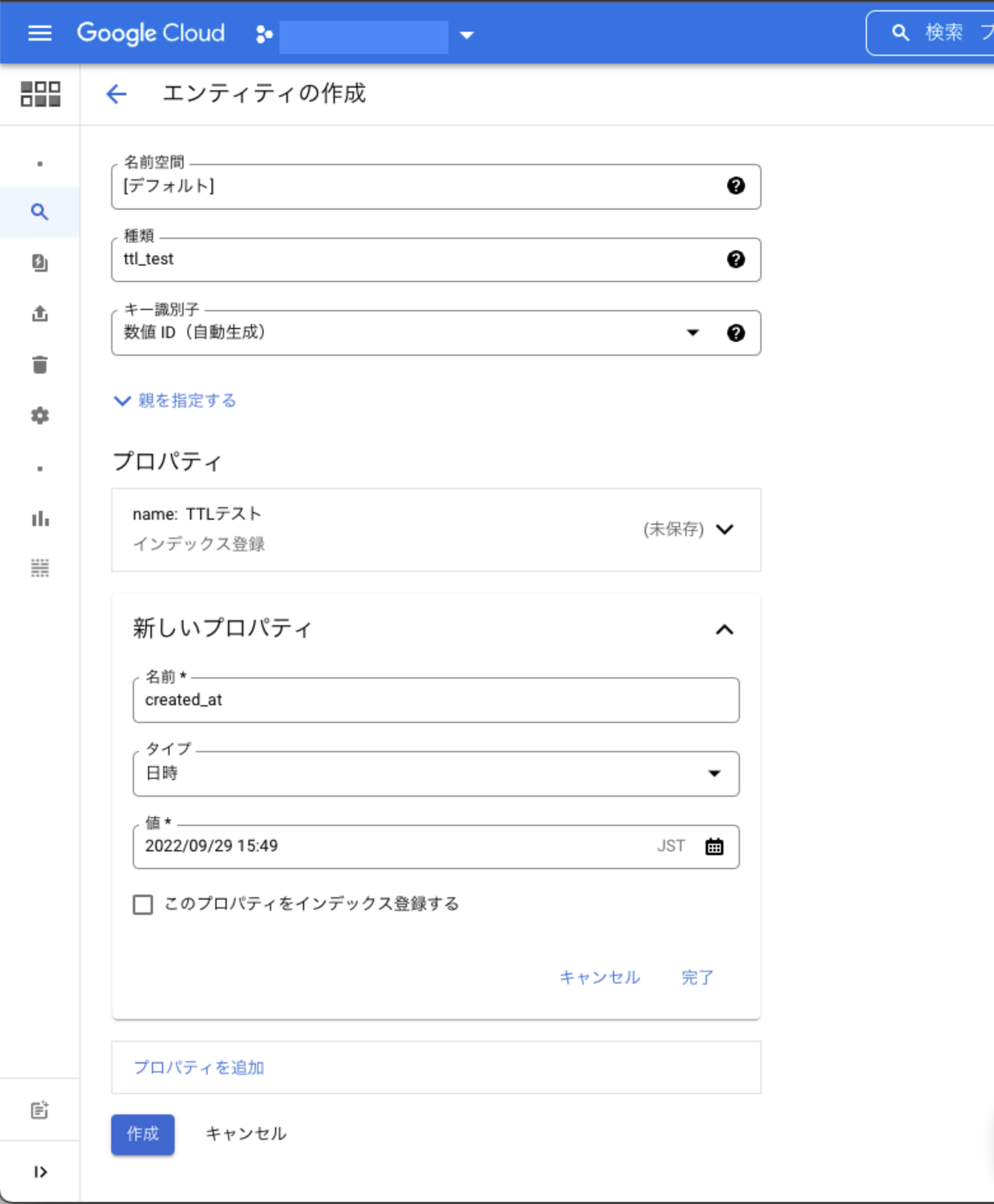 「ttl_test」という種類を用意し一つのエンティティを作成しました。プロパティは2つ用意し、それぞれname(文字列)、created_at(タイムスタンプ)としました。
