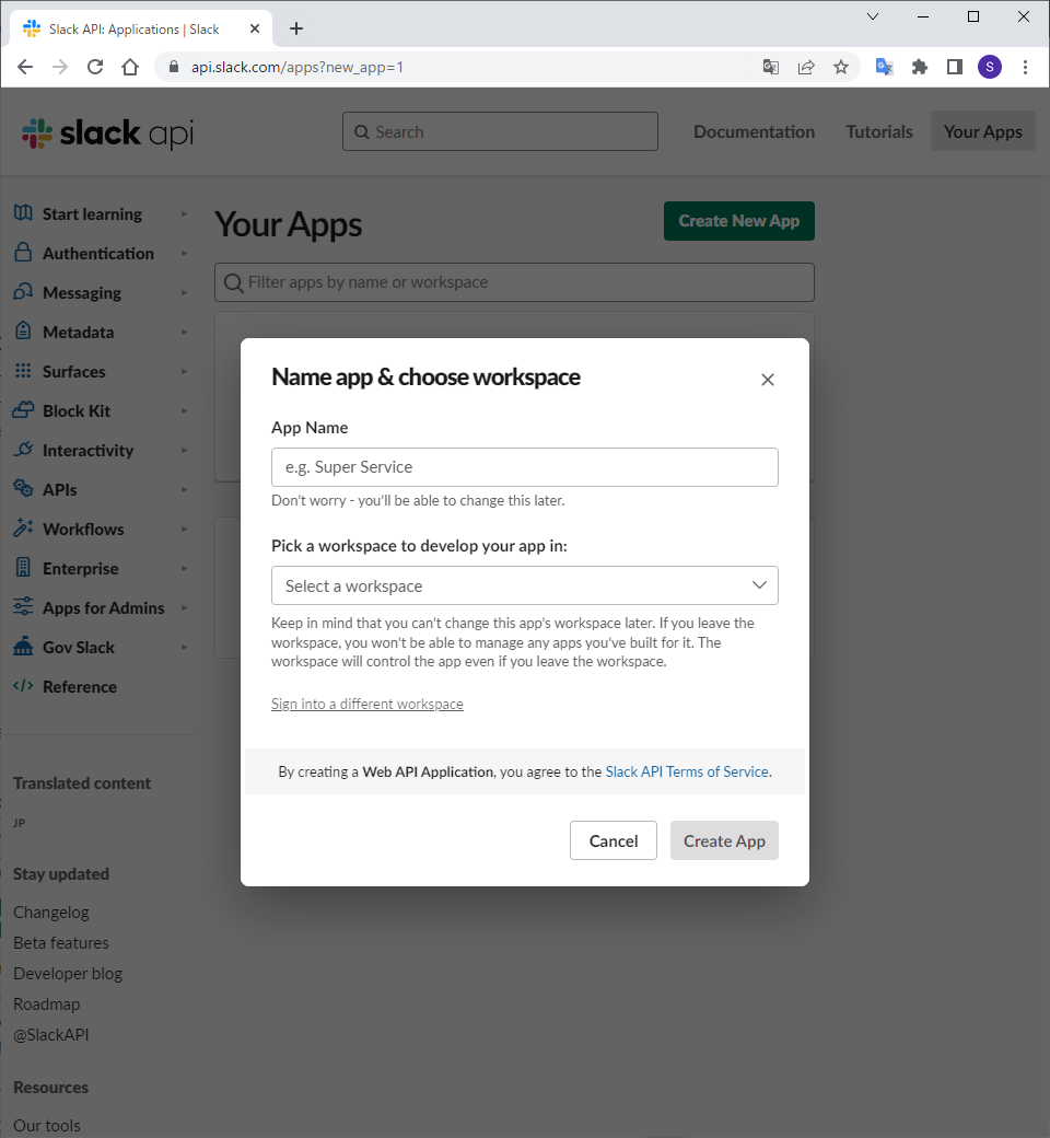 3.作成するアプリの名前と追加するワークスペースを入力してCreate Appを選択します。