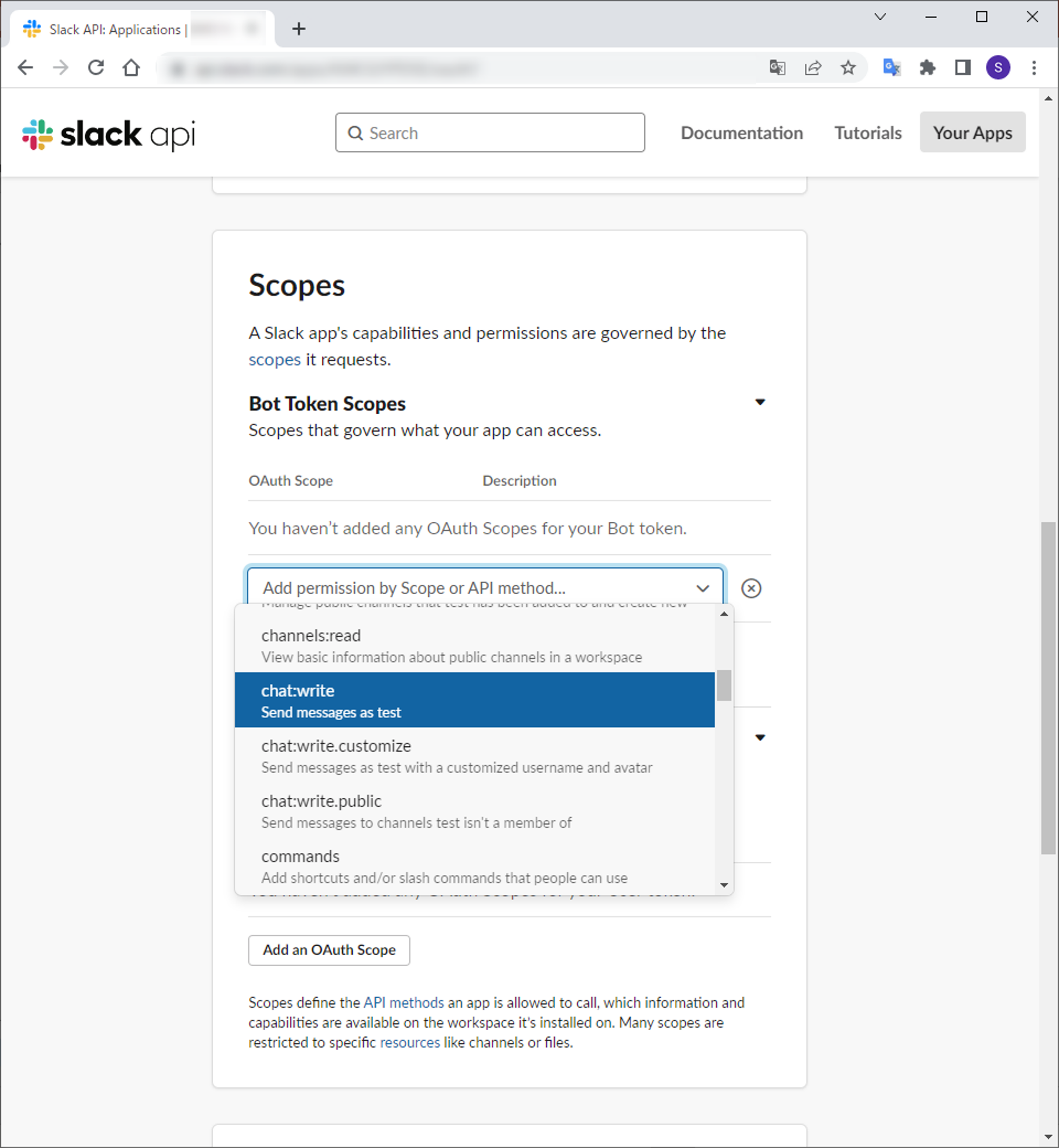 4.左のOAuth & Permissionsを選択して下にスクロールするとスコープの設定画面が表示されるのでメッセージを送信するためにchat:writeを追加します。