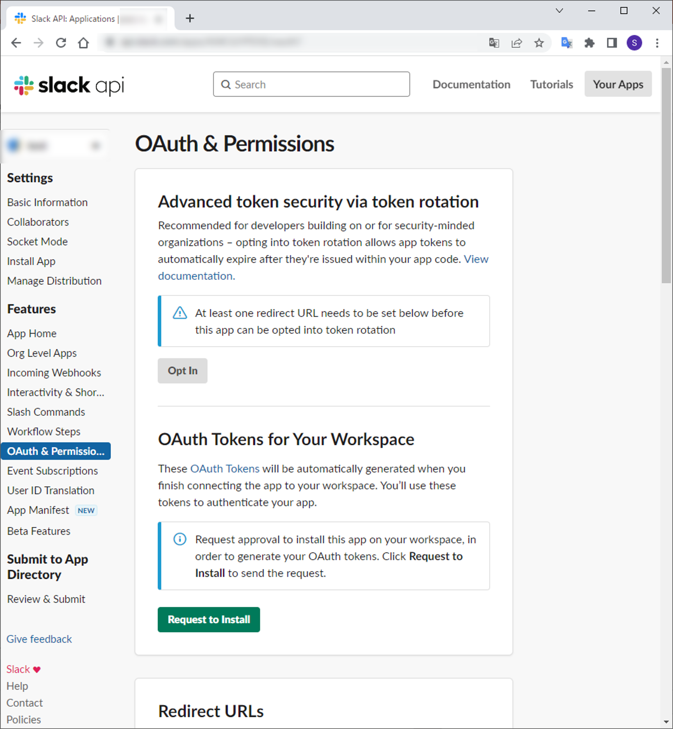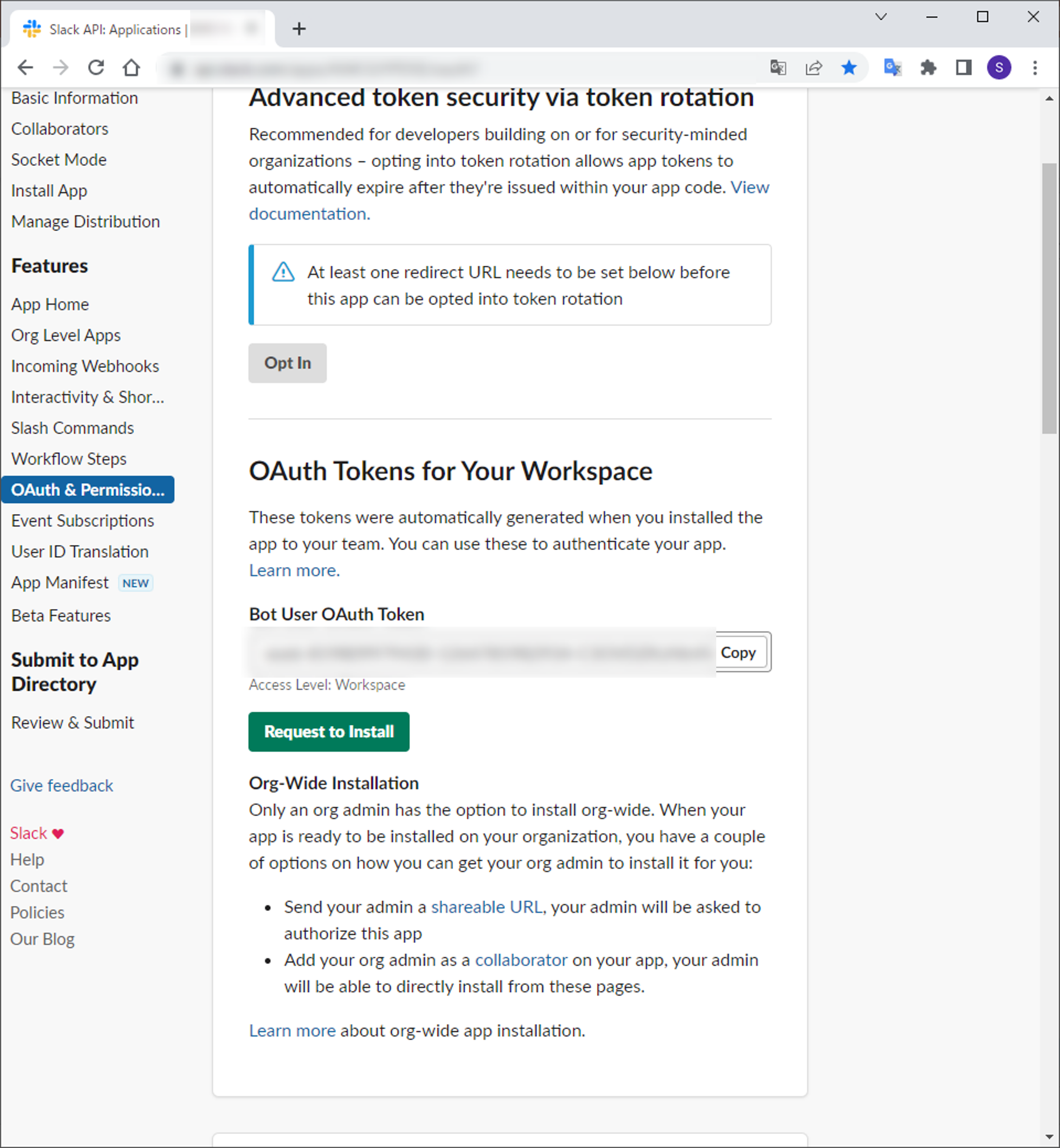 5.OAuth & Permissionsの上部にあるOAuth Tokens for Your WorkspaceのRequest to Installを選択して管理者にインストール依頼を出します。