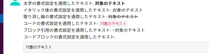 メッセージの書式は例えば太字にする場合は*対象のテキスト*のようにします。ブロック引用が反映されていませんが、>を行頭にしないと無効になるようですね。